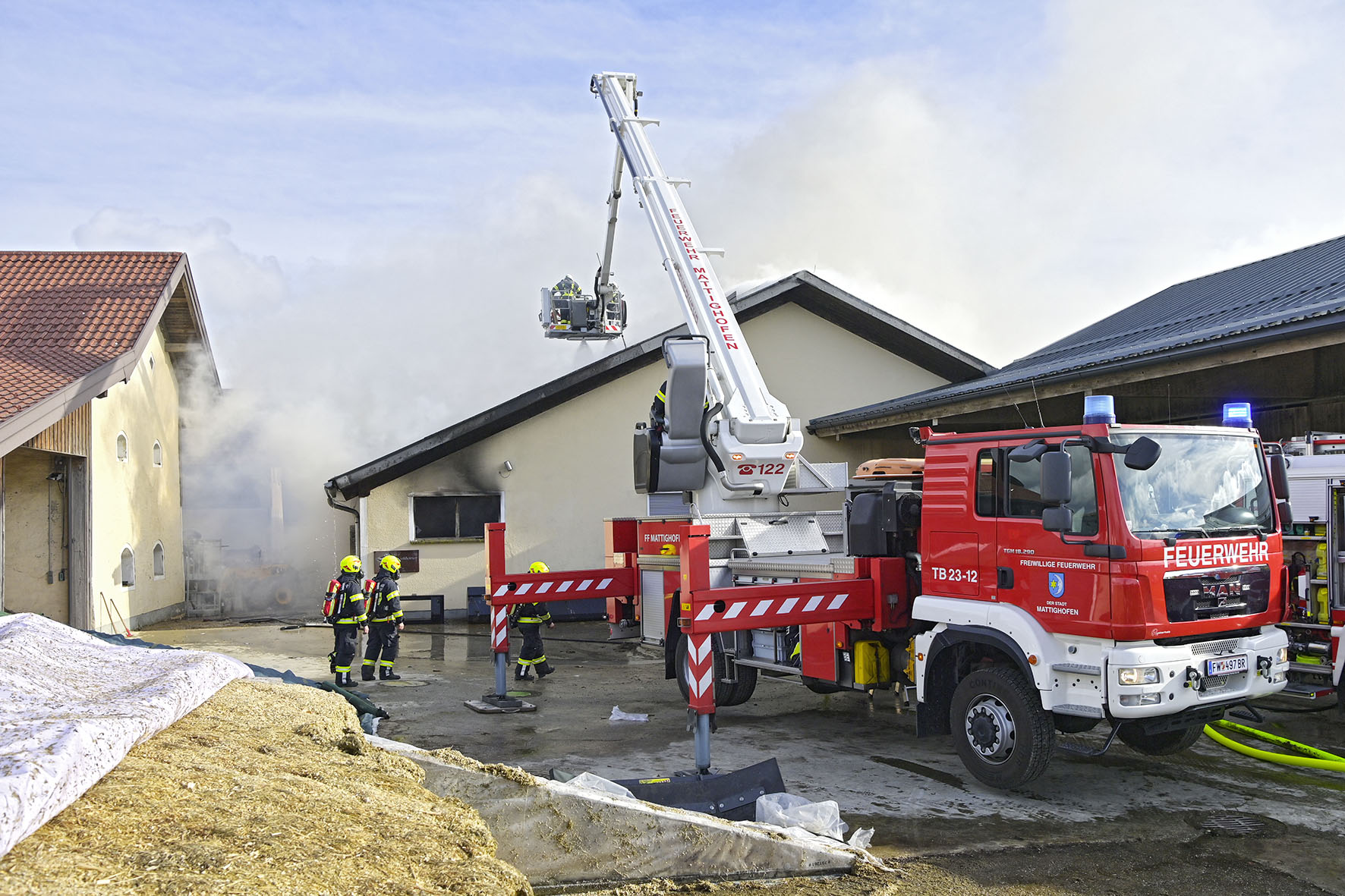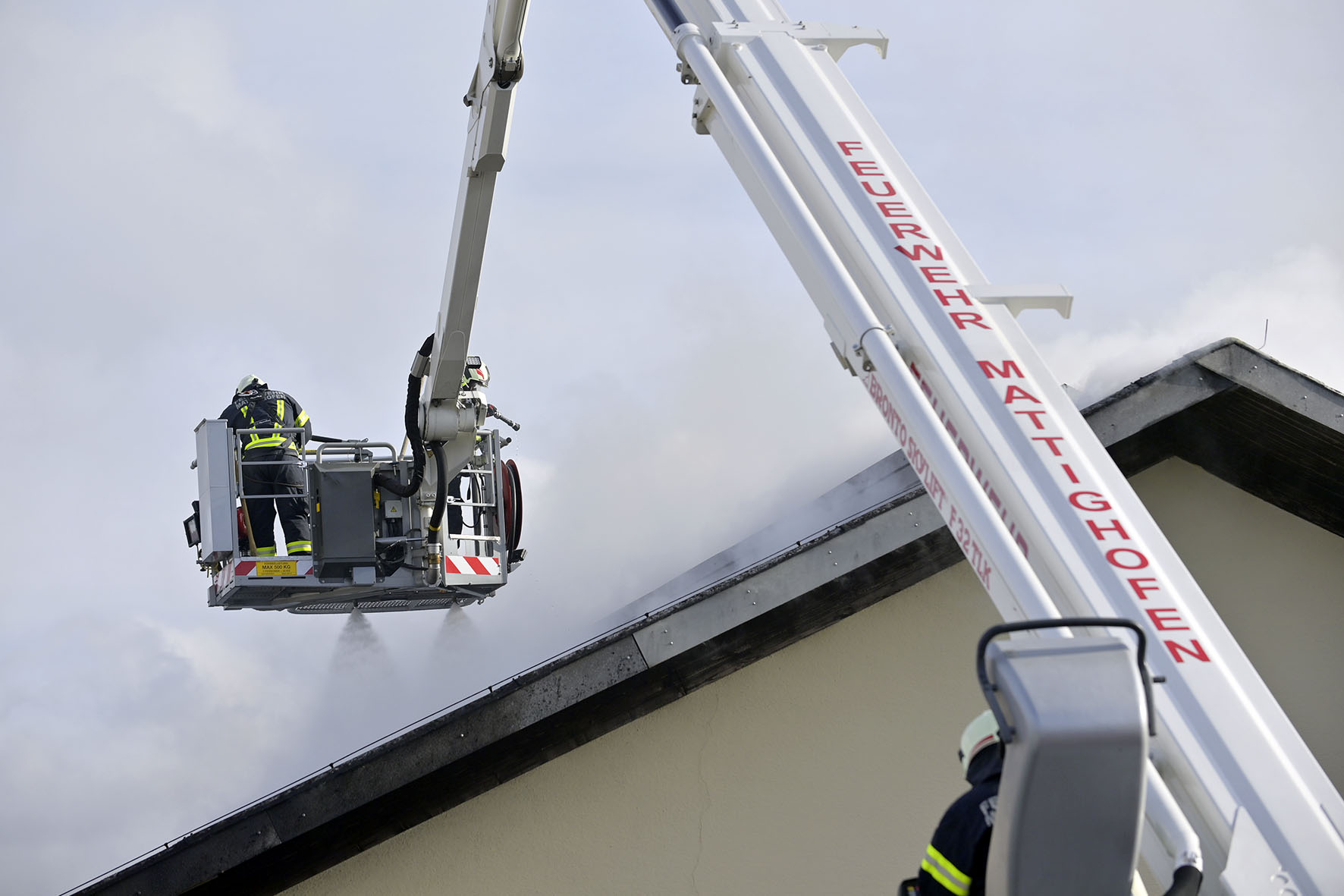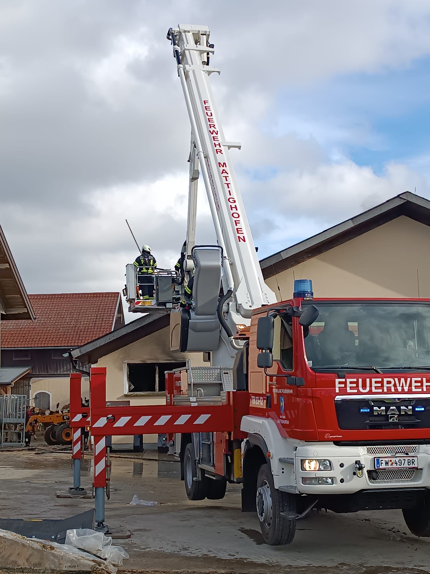 Die Aufgabe der Feuerwehr Mattighofen bestand zunächst darin, Teile des Daches abzudecken und den Brand von der Teleskopmastbühne aus zu bekämpfen.