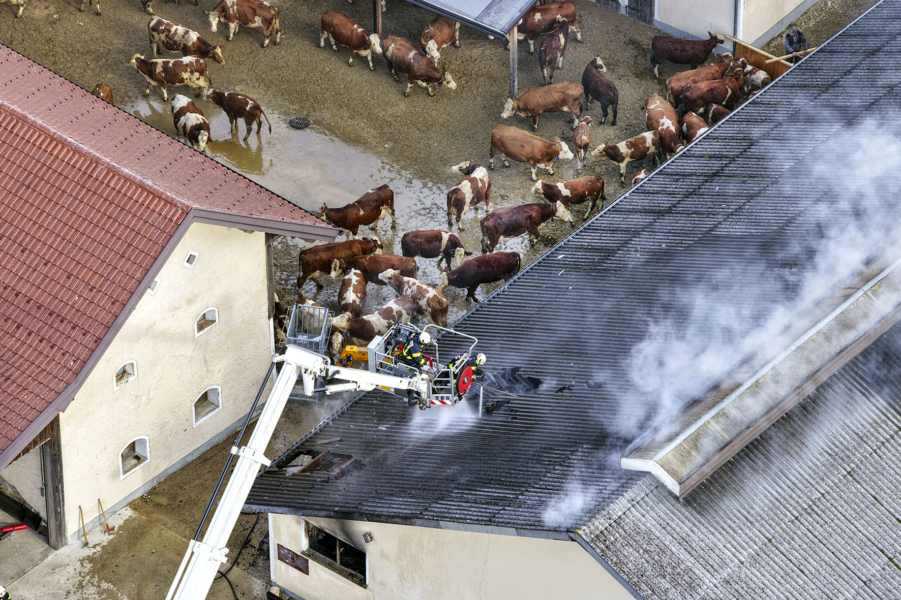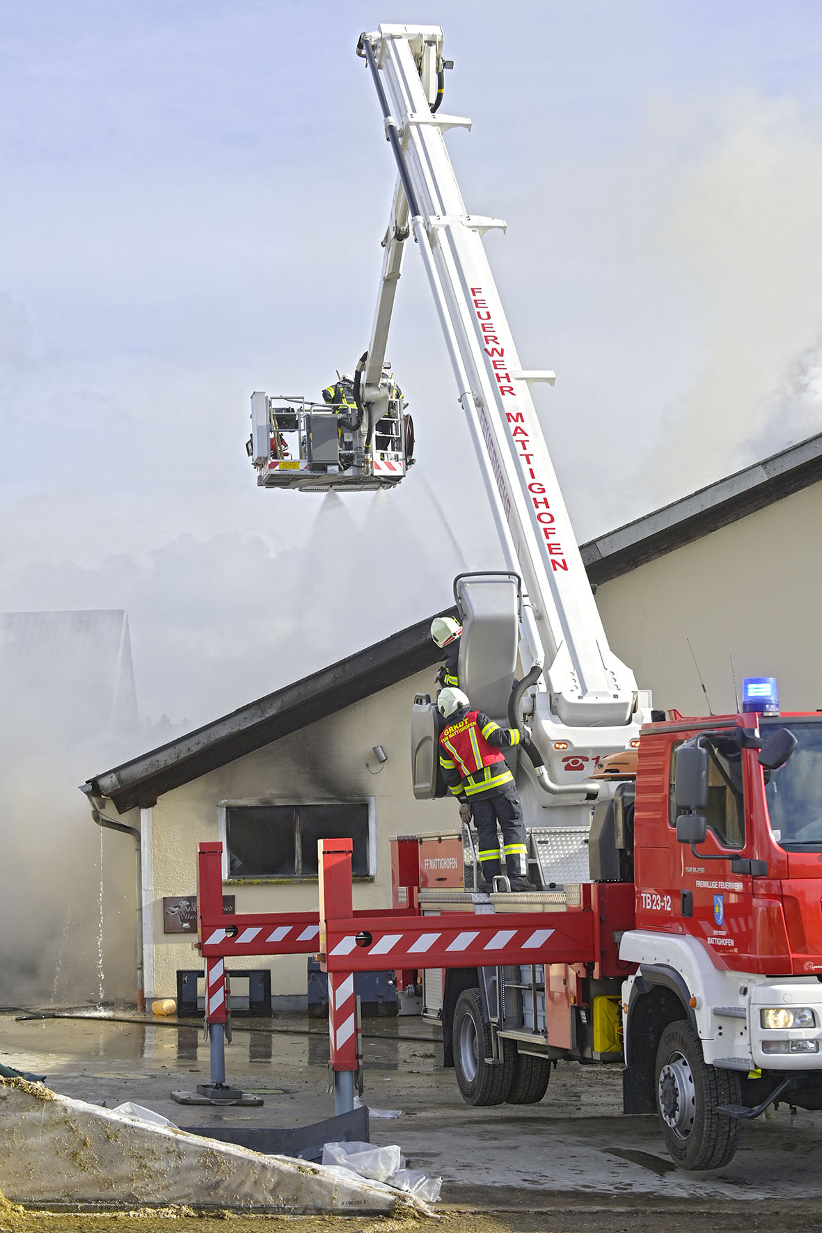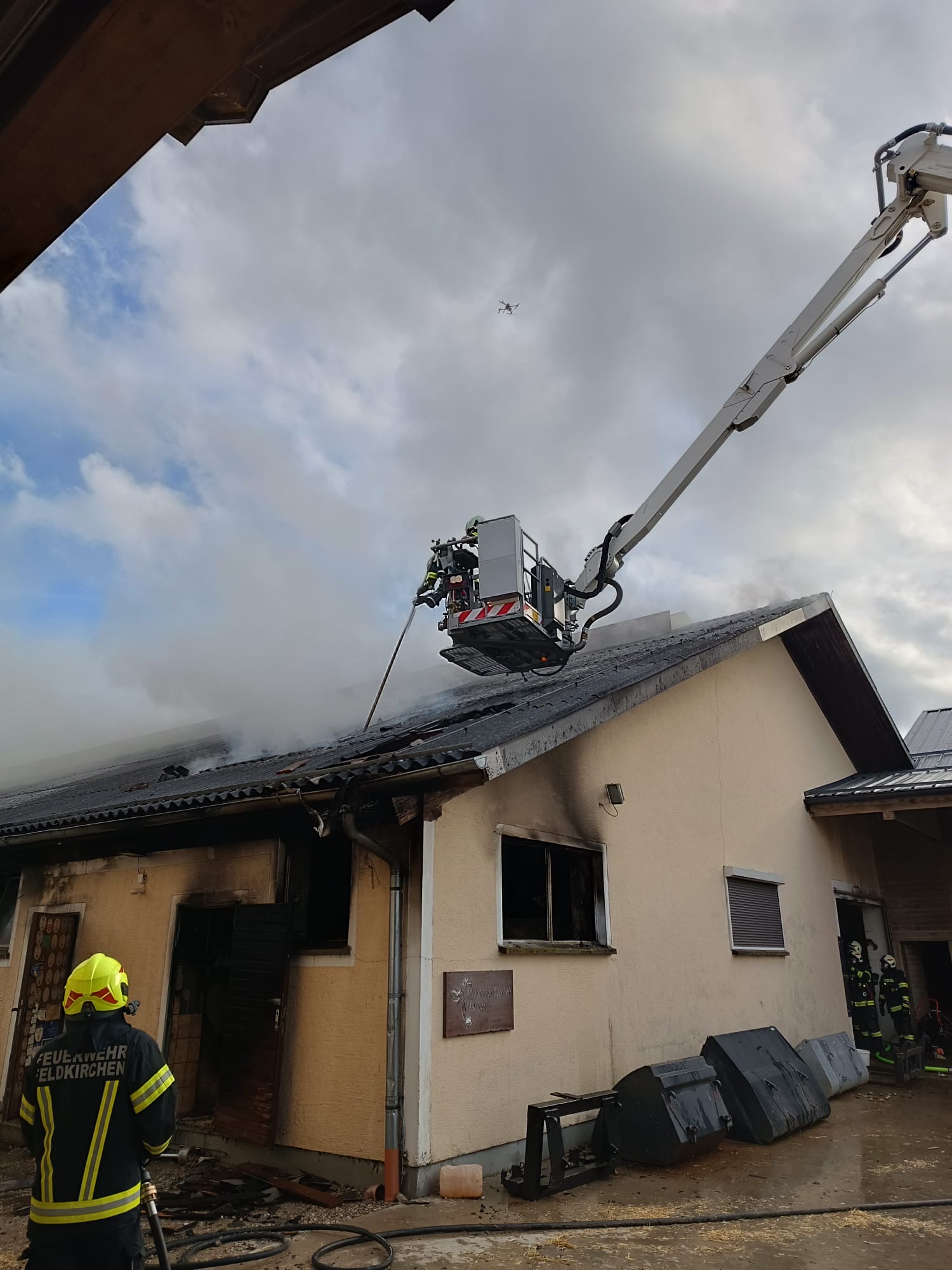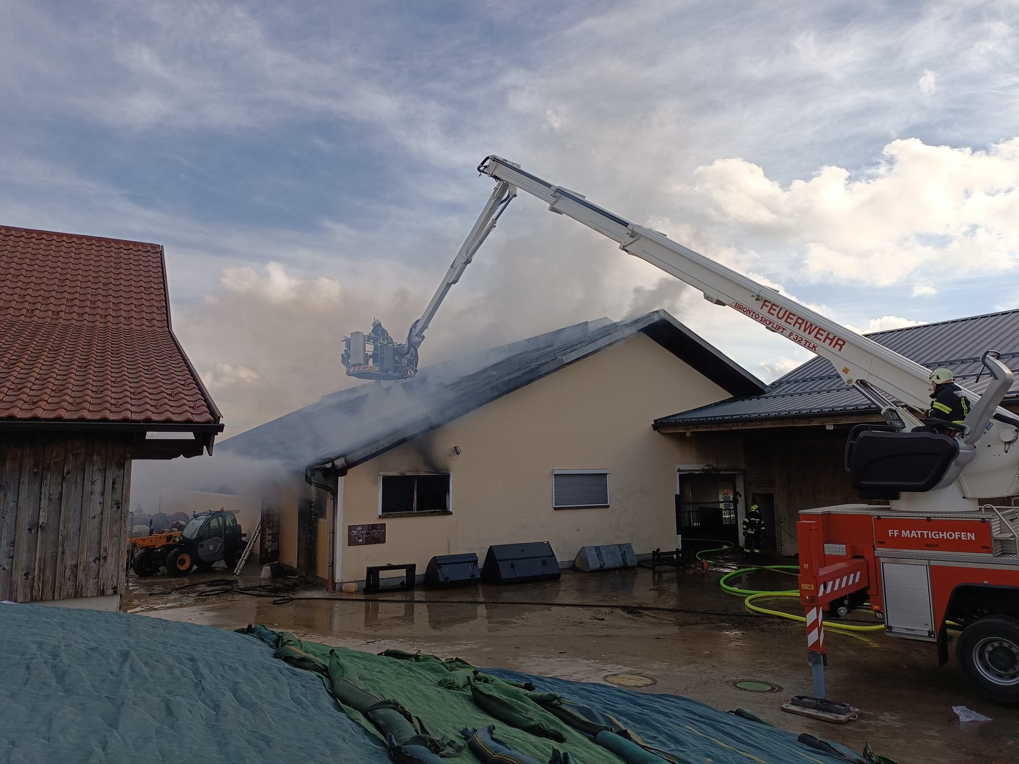 Die Aufgabe der Feuerwehr Mattighofen bestand zunächst darin, Teile des Daches abzudecken und den Brand von der Teleskopmastbühne aus zu bekämpfen.