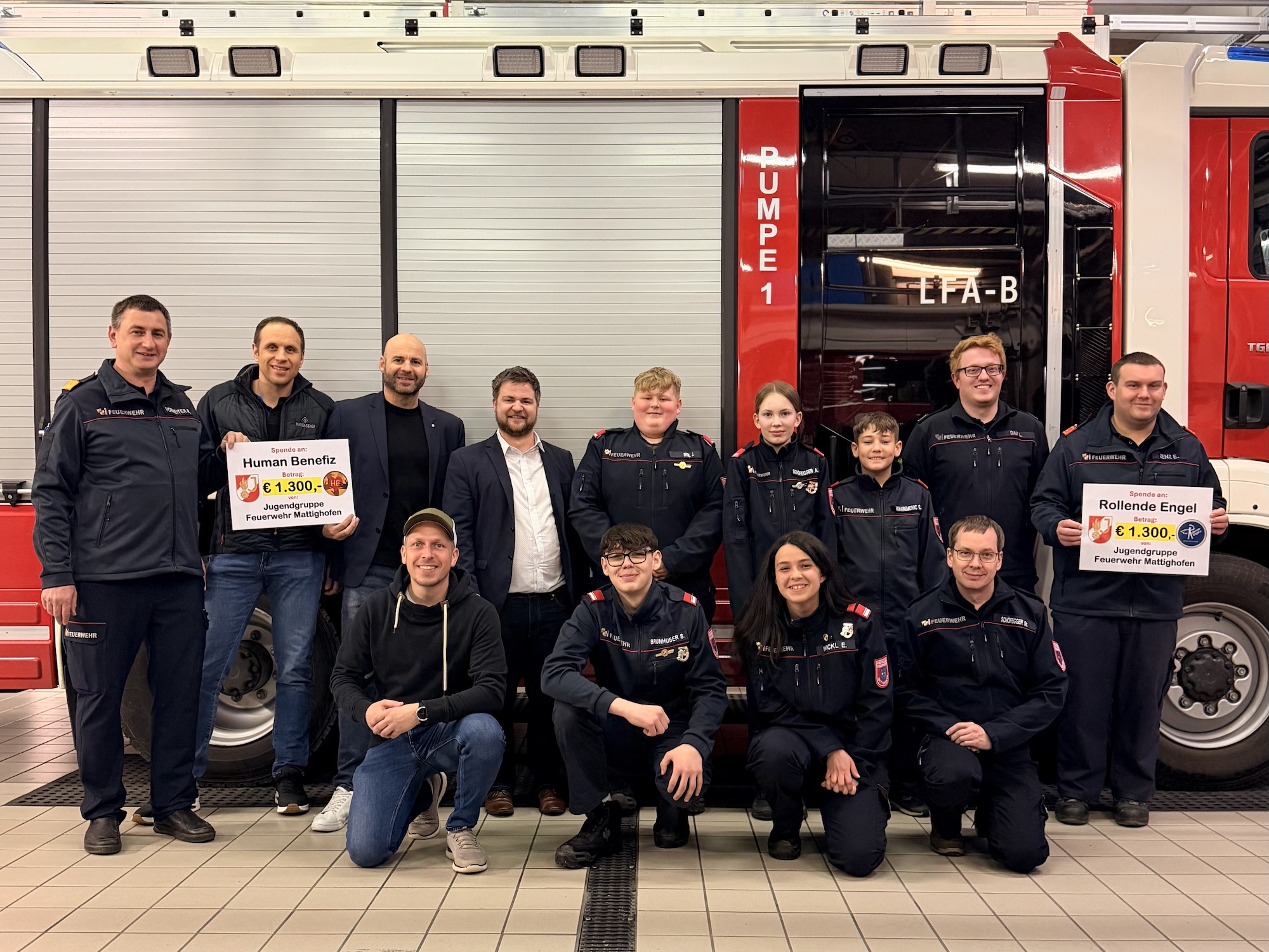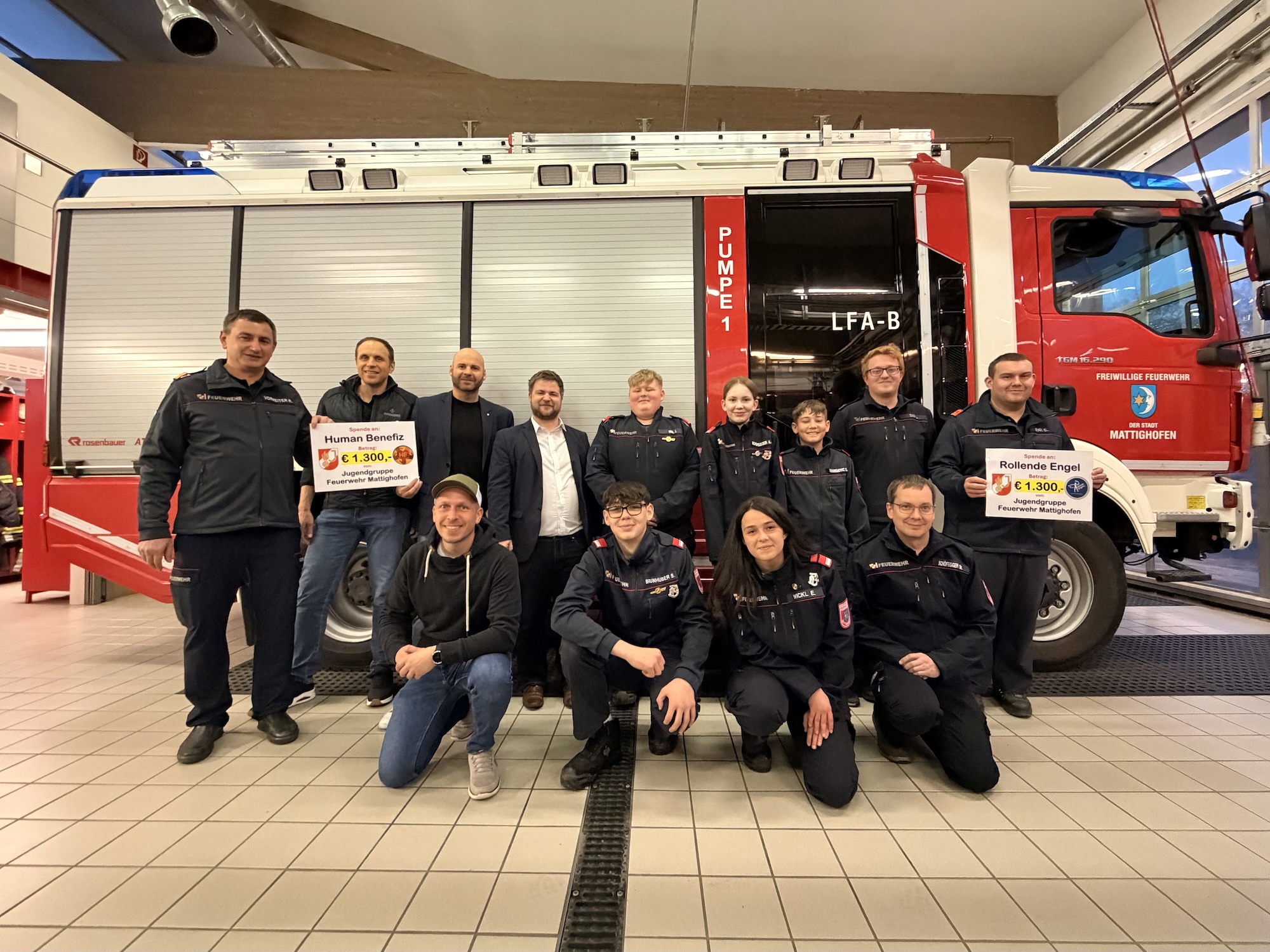 Die Jugendgruppe der Feuerwehr Mattighofen hat erneut ihr großes Engagement und ihre Hilfsbereitschaft unter Beweis gestellt. Insgesamt €2.600,- konnten an zwei wohltätige Organisationen gespendet werden. Jeweils €1.300,- gingen an die Vereine Human Benefiz sowie an die Rollenden Engel.